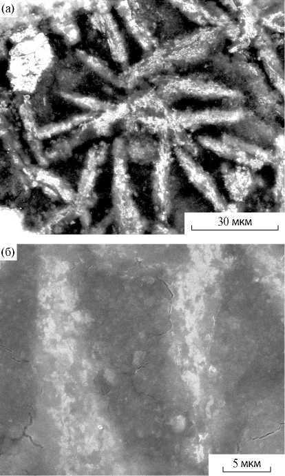 На рис. 2 приведена “дендритоподобная” структура образца соединения MgB2, полученная при горячем газостатическом прессовании порошков магния и бора [4]. Процесс кристаллизации интерметаллида MgB2 из расплава магния происходит в этих условиях путем последовательного зарождения и роста множества мелких кристалликов этого химического соединения, конгломерат которых и образует твердую фазу. “На общем темном фоне наблюдаются крупные иглы, часто исходящие из одного центра” (рис. 2а). “Хорошо видно при большом увеличении, что иглы и районы между ними состоят из отдельных кристалликов”, размеры которых составляют ~ 0.3–0.7 мкм (рис. 2б) [4].