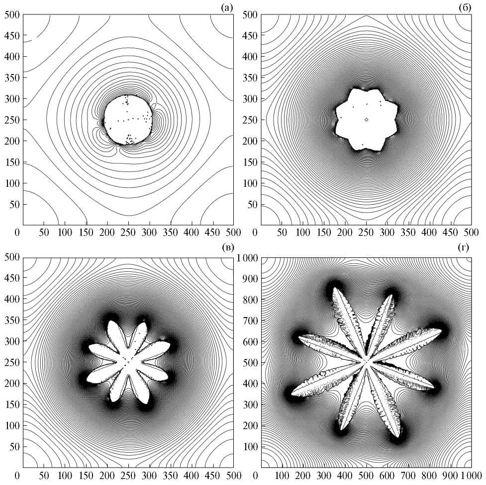 Рис. 3. Морфологии диссипативных структур, образующихся при росте твердой фазы из одного центра, в условиях “изотропного” кинетического коэффициента при различных значениях кинетического коэффициента (β), переохлаждения (пересыщения) расплава (∆T) и времени роста (∆t): (а) – 2.0, 0.020, 300; (б) – 1.0, 0.200, 50; (в) – 3.0, 0.200, 100; (г) – 3.0, 0.200, 500 [10, 11].