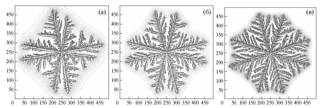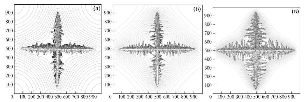 Рис. 4. Морфология диссипативных структур, образующихся в процессе кристаллизации расплава, и концентрационные поля (тонкие линии) в системе в некоторые моменты времени t~ для различных величин переохлаждения расплава ΔT~bath: (a) ΔT~bath = 0.01, t~ = 750; (б) ΔT~bath = 0.02, t~ = 230; (в) ΔT~bath = 0.05, t~ = 40. Изолинии безразмерных концентраций c~ построены с интервалами: (a) Δ c~ = 0.005, (б) Δ c~ = 0.010, (в) Δ c~ = 0.020 [14, 15].
