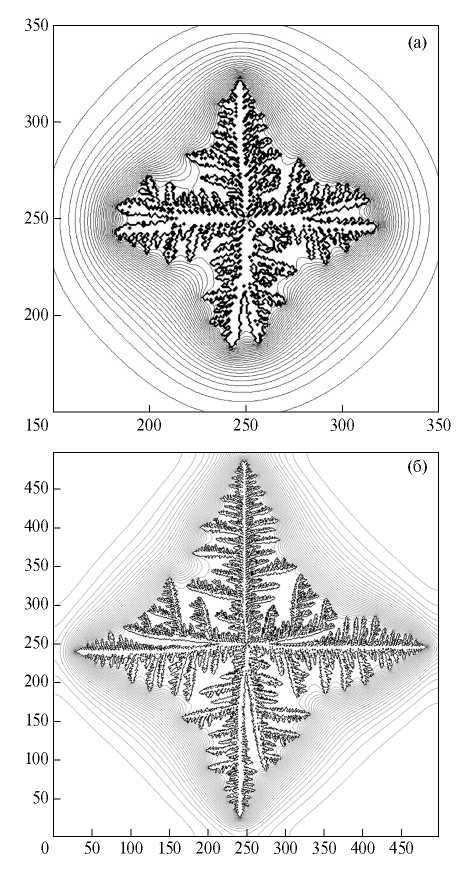 Рис. 5. Морфология диссипативных структур, образующихся в процессе кристаллизации расплава, и концентрационные поля (тонкие линии) в системе в последовательные моменты времени t~ для переохлаждения ΔT~bath = 0.055: (а) t~ = 20, (б) t~ = 75. Изолинии безразмерных концентраций c~ построены с интервалом Δ c~ = 0.02.