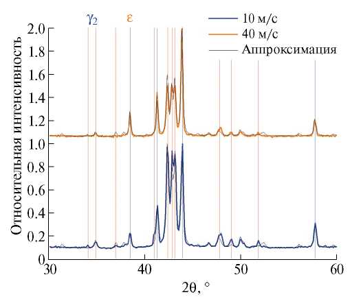 Рис. 1. Спектры рентгеновской дифракции лент, закалённых с различной линейной скоростью вращения медного колеса. Линии γ2-фазы обозначены красным, линии ε-фазы – синим.