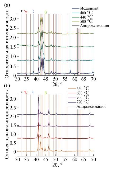 Рис. 4. Спектры рентгеновской дифракции закалённой и отожжённых при различных температурах лент (продолжительность отжига 20 мин). На экспериментальные спектры наложены аппроксимирующие спектры, полученные методом Ритвельда. Линии γ2-фазы обозначены красным, линии ε-фазы – синим, τ-фазы – чёрным, (β-Mn) – зелёным.