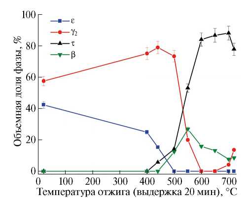 Образец, отожжённый при 440 °C, имел следующий фазовый состав: γ2–79.0 %, ε – 15.3 % и τ – 5.7 %. Присутствие τ-фазы в образце подтверждается откликом ленты на внешнее магнитное поле. Доля γ2-фазы при повышении температуры отжига от 400 до 440 °C остаётся неизменной в пределах ошибки.