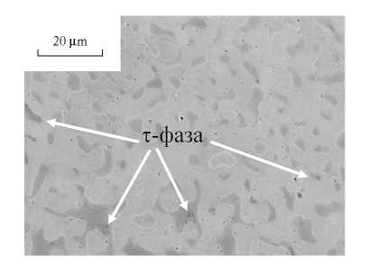 Анализ параметров решётки τ-фазы показал следующее. После отжига при температуре 440 °C параметры решётки τ-фазы составили а = 2.786 Å, с = 3.524 Å, отношение параметров с/а = 1.265. Проведение исследования данной ленты методом РЭМ в сигнале отражённых электронов показало наличие малых тёмных областей внутри исходной ε-фазы (рис. 6). Тёмный оттенок указывает на то, что эти области обеднены по элементам с большим атомным номером (в данном случае, по Mn или Ga). Обеднение τ-фазы по этим элементам приводит к уменьшению степени тетрагональности решётки, что согласуется с результатами рентгеноструктурного анализа. Авторы работы [11] отмечают отличия состава фаз L10 (ε) и L102) по содержанию Mn. Однако в настоящем исследовании достоверно установить состав τ-фазы после отжига при 440 °C методом микрорентгеноспектрального анализа не представлялось возможным ввиду малого размера областей.