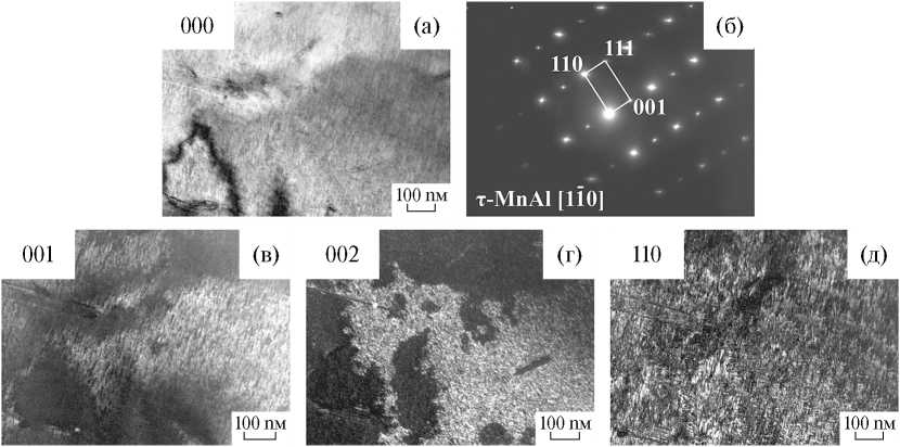 Рис. 7. Микроструктура τ-фазы ленты, отожжённой при 700 °C 20 мин: светлопольное (000) (а) и темнопольные (001) (в), (002) (г), (110) (д) изображения, обозначения изображений соответствуют рефлексам на электронограмме (б).