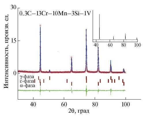 Рис. 2. Экспериментальная (красные кружки) и расчетная (огибающая синяя линия) рентгенограммы закаленной ленты из стали 0.3C–13Cr–10Mn–3Si–1V. Зеленая линия – разность между экспериментом и расчетом. Штрихи сверху вниз: угловые положения рефлексов γ-фазы твердого раствора железа, гексагональной ε-фазы и ОЦК α-фазы Fe, использовавшихся при подгонке. На вставке рентгенограмма порошка α-фазы железа.