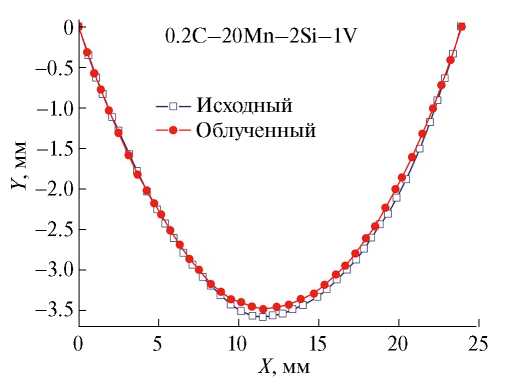 Рис. 4. Средняя линия боковой проекции образца из стали 0.2C–20Mn–2Si–1V в исходном состоянии и после облучения флюенсом быстрых нейтронов 6 ∙ 1019 см–2.