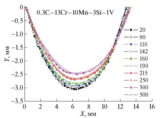 Рис. 5. Средняя линия боковой проекции образца из стали 0.3C–13Cr–10Mn–3Si–1V после последовательных часовых отжигов при температурах 90, 110, 142, 160, 190, 215, 250, 300, 500 °C. Точки, соответствующие исходному состоянию образца, обозначенный как 20 °C.