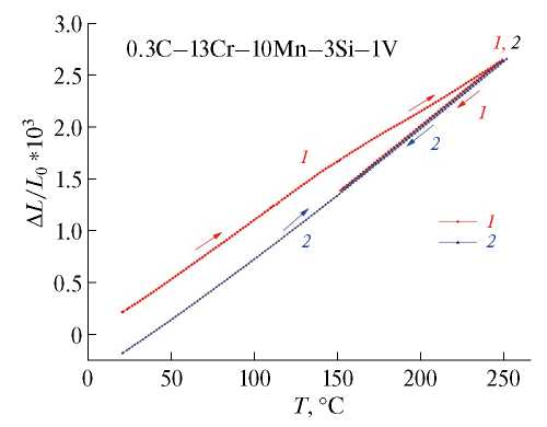 Рис. 7. Температурная зависимость относительного удлинения предварительно деформированного образца из стали 0.3C–13Cr–10Mn–3Si–1V, полученная в ходе дилатометрических измерений с двумя проходами интервала температур 20–250 °C.