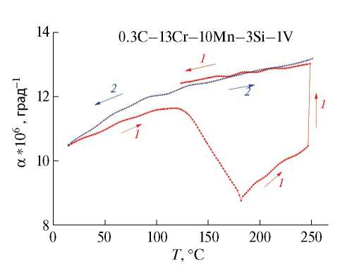 Рис. 8. Температурная зависимость коэффициента термического линейного расширения образца из стали 0.3C–13Cr–10Mn–3Si–1V, полученная в ходе дилатометрических измерений.