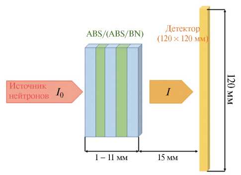 Были рассмотрены образцы для определения коэффициента пропускания (трансмиссии) ABS-пластика. В программном коде PHITS [8] проведены расчеты трансмиссии нейтронного излучения через образцы ABS и ABS с BN толщиной от 1 до 11 мм, с шагом 1 мм. Общая схема моделирования представлена на рис. 2. Массовое содержание нитрида бора составляло 30 %. Модель представляла собой блок с площадью поперечного сечения 10 × 10 мм и толщиной 11 мм, разделенный на слои по 1 мм. Размеры детектора составляли 120 × 120 мм таким образом, чтобы он перекрывал широкий диапазон телесных углов рассеяния нейтронов.