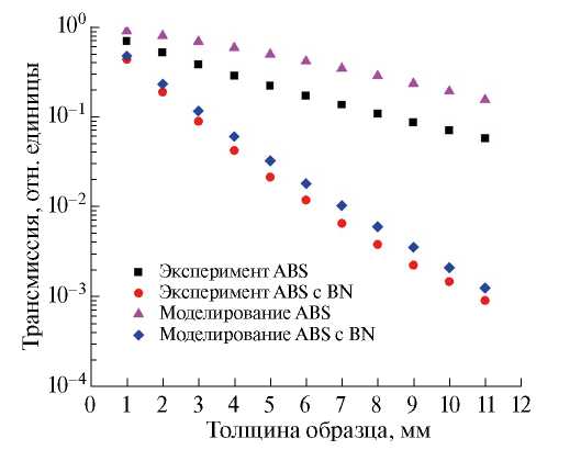 Рис. 5. Коэффициент пропускания для ABS и ABS + BN при использовании многослойных образцов.