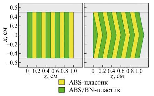 Выполнено моделирование трансмиссии в многослойных структурах ABS/(ABS+BN) c четными количествами слоев, расположенных перпендикулярно пучку, и постоянной суммарной толщиной от 1 мм до 11 мм. Суммарная толщина слоев каждого из двух типов, а следовательно, и массовая доля нитрида бора оставались постоянными при изменении числа слоев. Были также рассмотрены иные формы слоев, которые при данных параметрах пучка могут быть более эффективными, если они обеспечивают прохождение нейтронами большего расстояния в слое с нитридом бора, повышая вероятность столкновений с ядрами вещества (рис. 4). Результаты моделирования представлены на рис. 5.