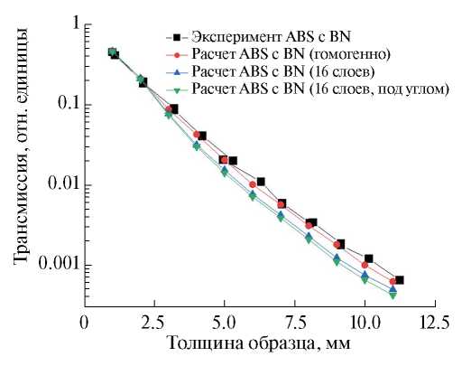 Отклонение в расчетных и экспериментальных результатах для ABS-пластика может быть связано, прежде всего, с различием в плотности отдельно взятых образцов. Основной вклад в поглощение вносит водород, поэтому даже незначительное расхождение в плотности приводит к искажению результатов. Для образцов с нитридом бора чувствительность трансмиссии к плотности образца снижается, что напрямую связано с экстремально высоким сечением поглощения бора в рассматриваемой энергетической области. Для расчета коэффициента пропускания образцов ABS-пластика с BN наблюдается хорошее совпадение с экспериментом.