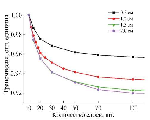 Для выбранных значений энергии максимальный выигрыш составляет 8 % при использовании 100 слоев для 20 мм образца. Дальнейшее увеличение толщины и количества слоев не имеет смысла, так как трансмиссия изменяется крайне слабо.