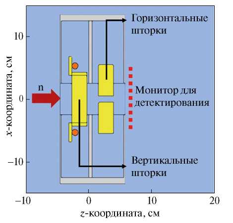 В качестве источника нейтронов принимался плоскопараллельный моноэнергетический пучок нейтронов с длиной волны 1Å и поперечным размером 6×6 см2. Сечения нейтронного пучка, обрезаемого шторками диафрагмы, составляло 3×3 см2.