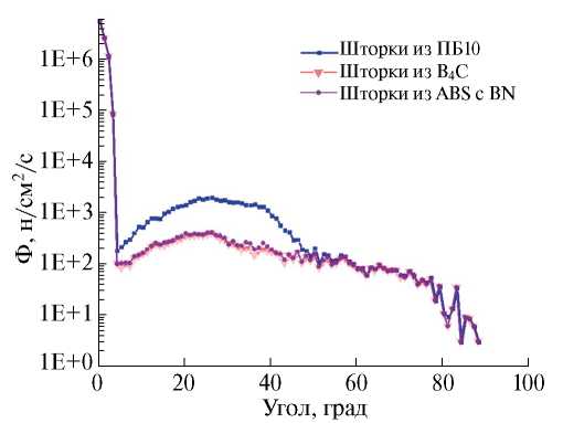 Характер распределения нейтронов для углов от 0° до 7.5° имеет идентичный вид для всех рассматриваемых шторок. Аналогичная ситуация наблюдается для углов более 50°. При этом на участке от 7.5° до 50° инегральный поток нейтронов более чем в 5 раз выше в случае использования ПБ10 в качестве материала поглощающих шторк. Для керамического карбида бора и ABS-пластика с нитридом бора резульаты абсолютно аналагичны. Различие данных материалов с ПБ10 можно связать исключительно с геомтрическим фактором – для достижения требуемой трансмисси необходима бо́льшая толщина борированого полиэтилена.