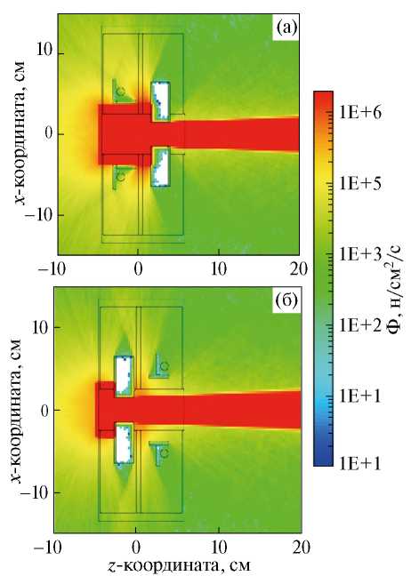 Рис. 10. Распределение нейтронов: а) в плоскости XZ (Y=0) расчетной модели; б) в плоскости YZ (X=0) расчетной модели для шторок из ПБ10.