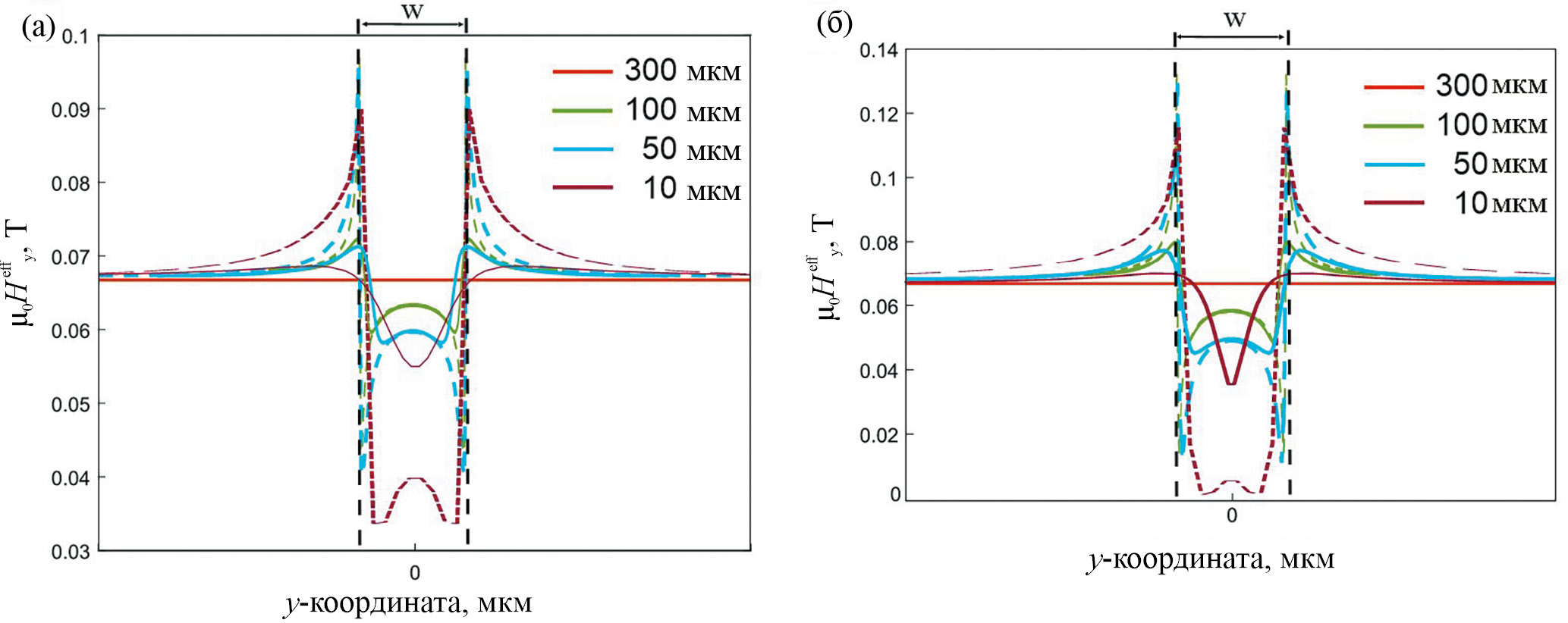 Рис. 2. Распределение Hyeff (z) в сечении y = Ly/2 в зависимости от ширины волновода w: a) LS-структура, б) HS-структура