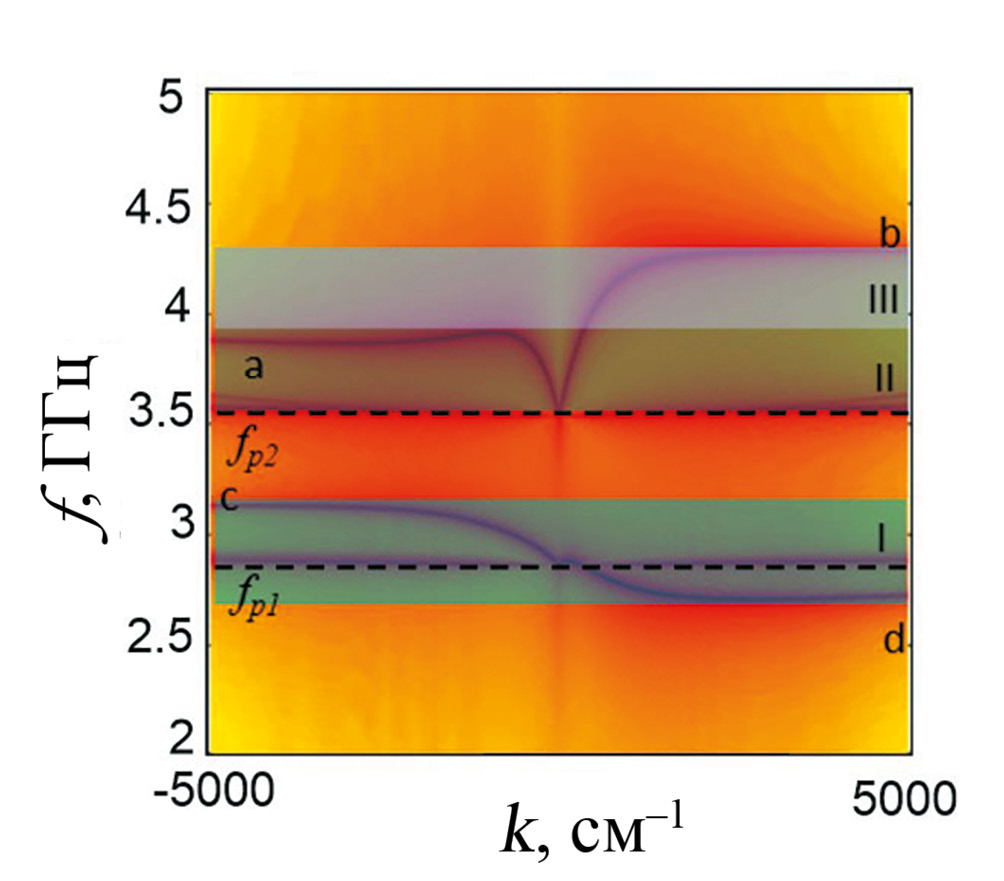 Анализ поперечного распределения волн показал, что ветви b и с относятся к спиновым волнам, распространяющимся по внешним поверхностям слоев. Ветвь a соответствует волне, распространяющейся по внутренней поверхности слоя с меньшей намагниченностью (т.е. подложки), ветвь d – волне, распространяющейся по внутренней поверхности слоя с большей намагниченностью (т.е. волновода). Кроме того, из анализа дисперсионных характеристик следует, что существуют различные режимы распространения спиновых волн. Частотная область I соответствует режиму одноволнового распространения (за исключением области малых волновых чисел вблизи fp1) [28–32]. В этом режиме на частоте f из области I волна распространяется только в одну сторону. В частности, в области I на частоте f<fp1 фазовая скорость положительна, а групповая скорость отрицательна (обратная волна). На частоте f > fp1 фазовая скорость отрицательна, и групповая скорость отрицательна (прямая волна). Следовательно, в частотной области I спиновая волна переносит энергию только в направлении x = –∞.