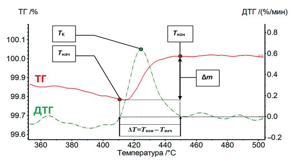 Анализ аномалии по термогравиметрической (ТГ) и деривативной термогравиметрической (ДТГ) кривым позволяет получить информацию о магнитном фазовом переходе. Его главными показателями являются: температурный диапазон перехода ΔT(°С) – диапазон, в котором наблюдается аномалия повышения веса; Δm(%) – относительное увеличение веса; TК(°С) – температура Кюри, соответствующая температуре, при которой скорость нарастания веса была максимальной (положение пика ДТГ-кривой).