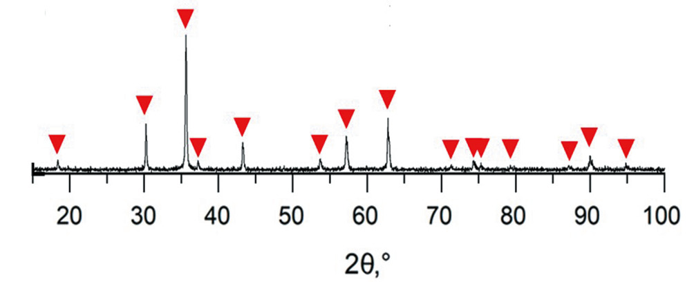 Рис. 3. Рентгенограмма синтезированного НЦФ (▼ – положение рефлексов фазы Ni0.73Zn0.29Fe1.98O4)