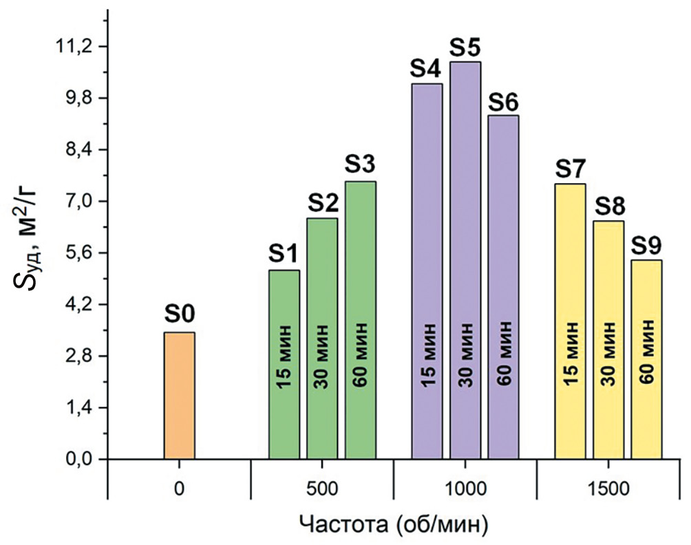 Анализ дисперсности порошка по методу БЭТ. Столбчатая диаграмма с полученными данными по площади удельной поверхности порошков НЦФ представлена на рис. 4. С увеличением частоты измельчения до 1000 об/мин удельная площадь сначала начинает расти, а затем наблюдается тенденция к ее уменьшению. Причиной этому может быть появление крупных агломератов частиц, которые образуются на высоких частотах оборотов размольной гарнитуры при сухом измельчении.