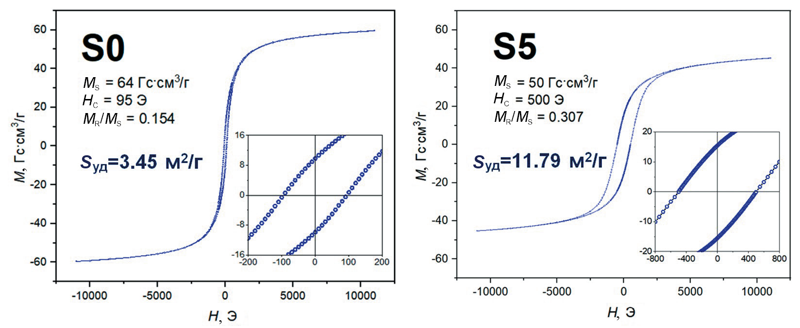 Петли гистерезиса исходного образца S0 и образца с наибольшей площадью удельной поверхности S5 представлены на рис. 6. Наблюдается тенденция уменьшения намагниченности насыщения с увеличением времени измельчения порошков (рис. 7). Это может быть связано с увеличением дефектов кристаллической структуры частиц феррита при длительных механических воздействиях на них в шаровой мельнице. Постепенное накопление дефектов уменьшает число возможных сверхобменных взаимодействий в кристаллитах, что уменьшает намагниченность всего образца в целом.