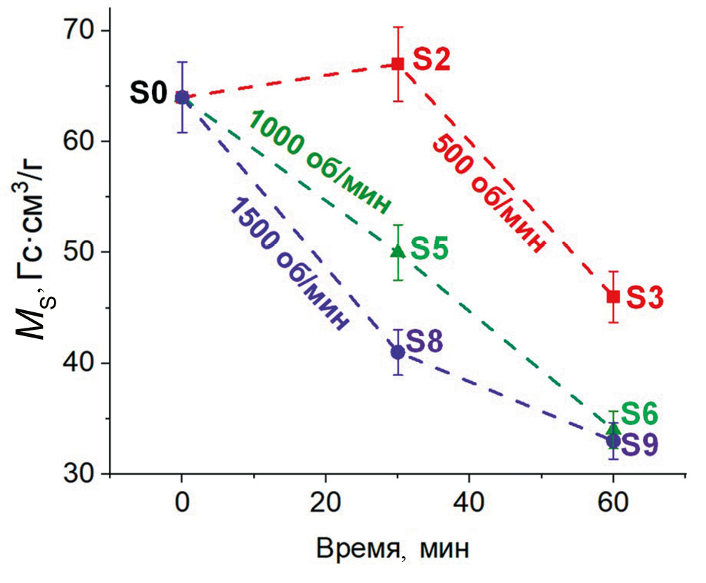 Рис. 7. Зависимость намагниченности насыщения от режимов измельчения НЦФ