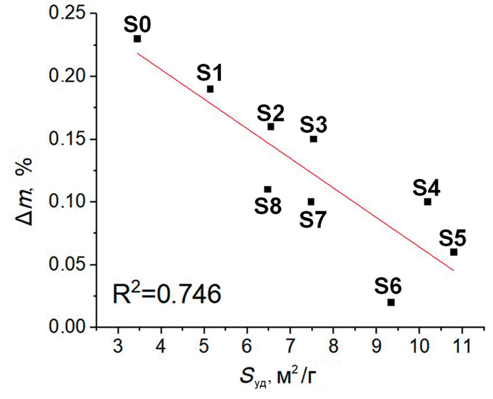 Установлено, что от площади удельной поверхности зависит величина весовой ступени Δm термической аномалии (рис. 10). Это может быть объяснено фактором повышения дефектов кристаллической структуры с каждым появлением новой поверхности при разрушении исходной частицы. Разрыв сверхобменных связей приводит к уменьшению намагниченности порошка, что снижает степень его взаимодействия с внешним магнитным полем.