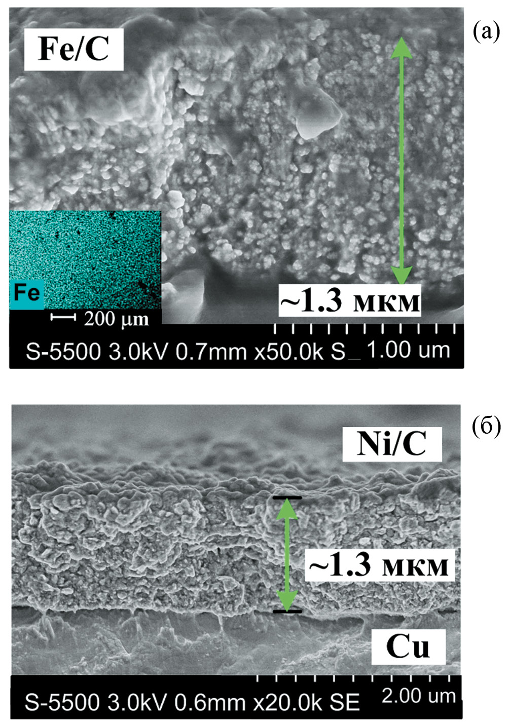 Рис. 2. СЭМ-изображение покрытий Fe/С (а) и Ni–С (б). На вставке СЭМ-изображения Fe/C представлено рентгеновское картирование поверхности