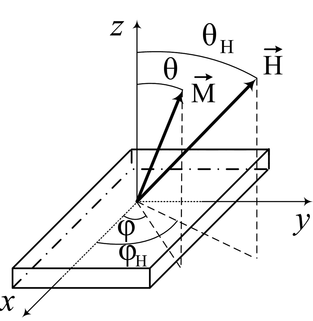 Система уравнений, позволяющая выразить зависимость резонансного поля от угла в сферической системе координат, была получена с учетом уравнения Ландау–Лифшица для движения намагниченности M и минимизацией полной энергии магнитной системы Е [22–24], представленной выражением: