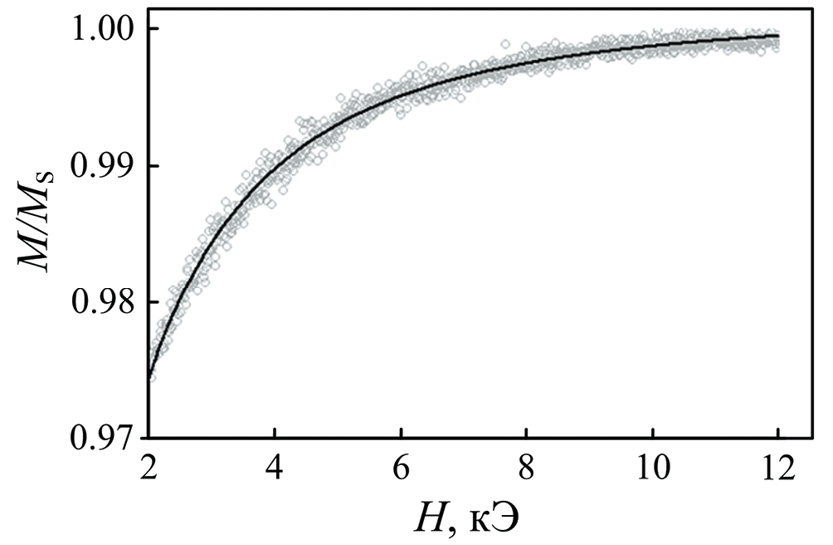 Рис. 4. Приближение намагниченности к насыщению на примере покрытия железа. Черная сплошная линия – фитинг уравнением (1)