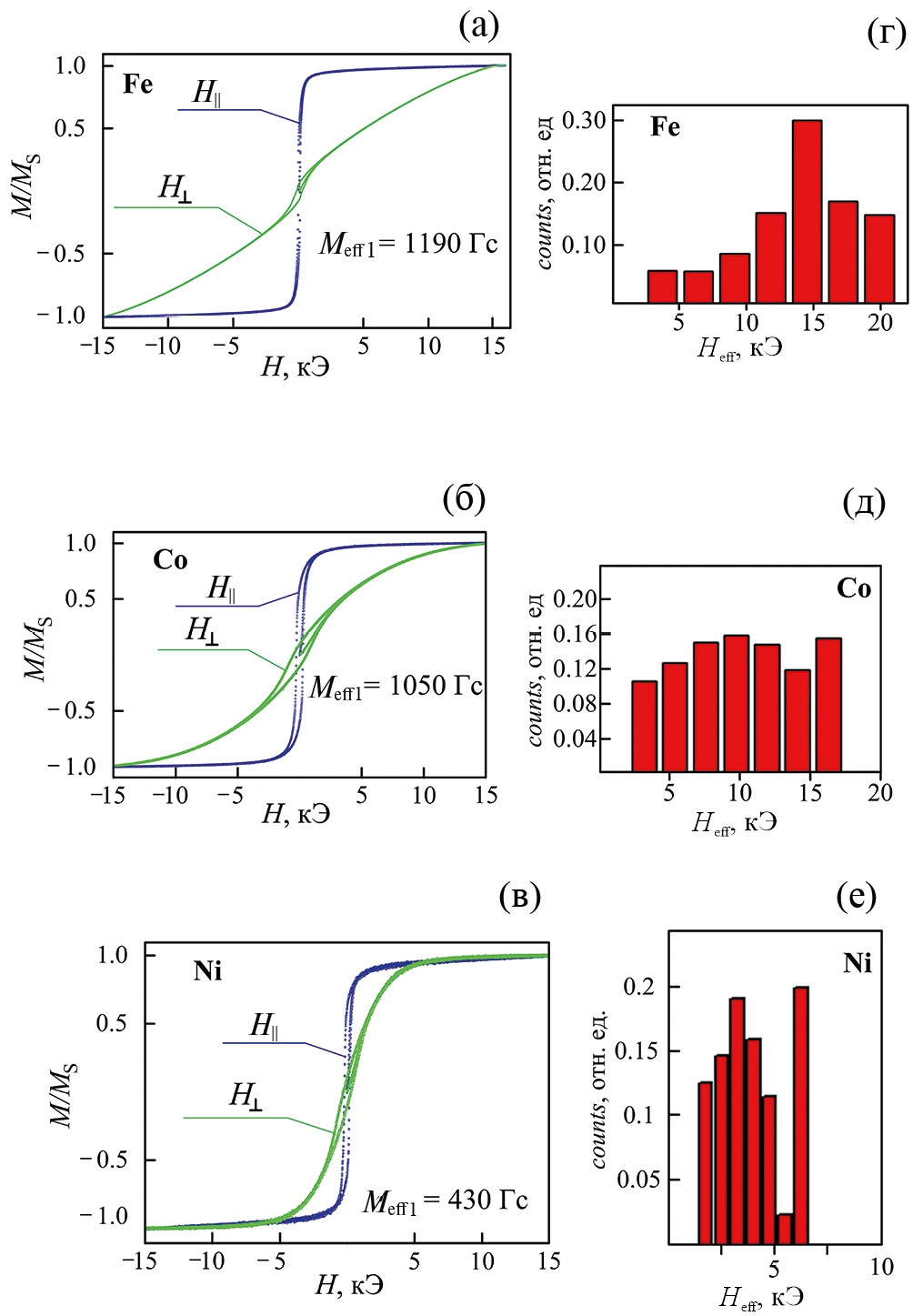 Рис. 5. Кривые намагничивания (а, б, в) в поле направленном параллельно (H||) и перпендикулярно (H⊥) плоскости углеродосодержащих покрытий Fe (a), Co (б) и Ni (в), а также гистограммы распределения эффективного внутреннего поля (г, д, е)
