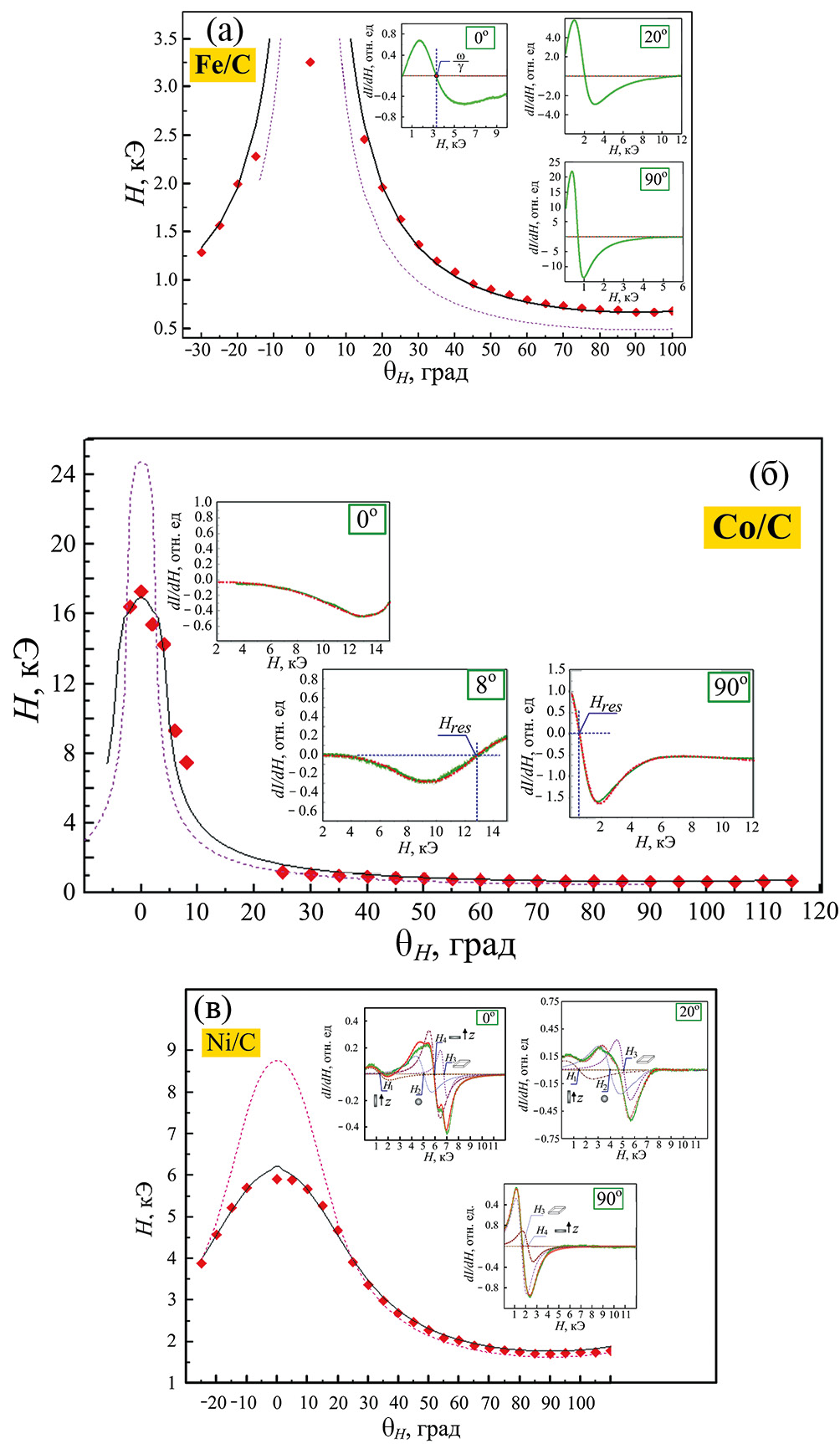 Рис. 7. Угловые зависимости резонансного поля покрытий Fe/C (а), Co/C (б) и Ni/C (в). Ромбами отмечены экспериментальные значения, сплошной линией – подгоночная кривая, рассчитанная при учете неоднородного внутреннего поля, пунктирная линия демонстрирует подгоночную кривую в случае однородной тонкой пленки. На вставках продемонстрированы экспериментальные кривые ФМР при некоторых углах между нормалью (ось z) и направлением внешнего поля, а также кривые, используемые при разложении экспериментального спектра