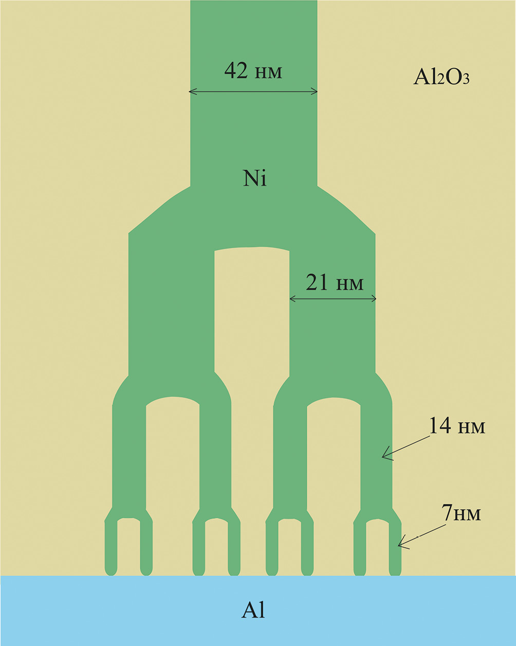 Развитие методов синтеза позволило получать нанопроволоки различных составов, структуры и морфологии, а это обеспечило возможность прецизионного контроля их формы, в том числе создания дендритных структур с контролируемым количеством ветвлений [12–20]. Было показано, что такие структуры имеют широкий спектр потенциальных применений от биомедицинских приложений до нейроморфных вычислений [21–24]. Одним из наиболее эффективных методов синтеза таких структур является осаждение материала в шаблон оксида алюминия. Преимуществом данного метода является возможность прецизионного контроля размера, формы и структурных свойств нанопроволок или ветвистых структур на их основе. Механизм произрастания пор подробно описан в работе [25]. Ветвление начальных пор обусловлено понижением напряжения и продолжением роста каналов на местах с более тонким барьерным слоем. Также при таком подходе существует возможность синтеза нанопроволок с помощью электролитического осаждения, в режиме как постоянного, так и переменного тока, и возможность получения мультисегметных и модулируемых структур [25–27].