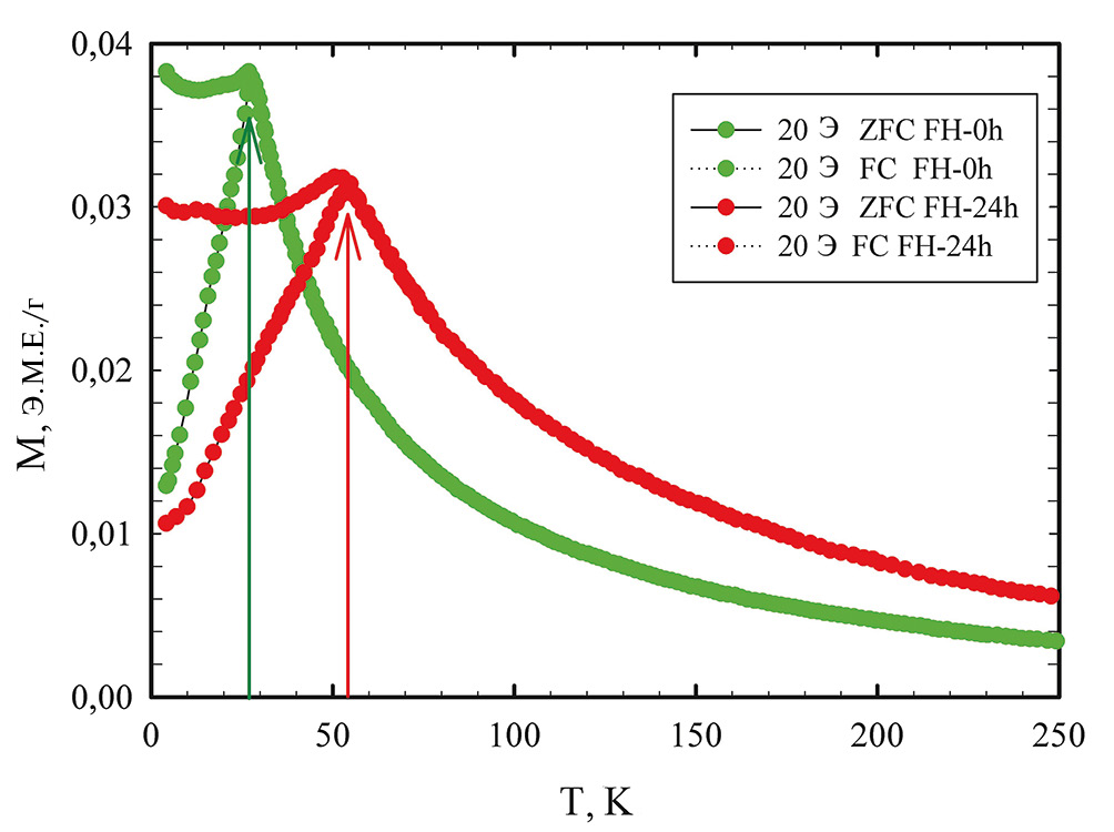 Регулирование магнитных межчастичных взаимодействий позволяет варьировать температуру СПМ-блокировки в достаточно широких пределах. На примере наночастиц ферригирита было показано, что процедура низкотемпературного отжига приводит к увеличению температуры СПМ-блокировки от 28 К (для FH-0h) до 52 К (для FH-24h) по данным dc-намагниченности.