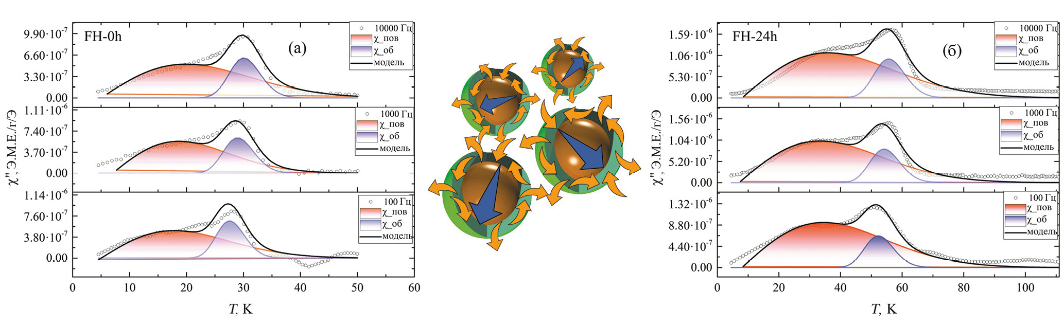 Таким образом, замораживание магнитных моментов на поверхности наночастиц является прямым следствием магнитных межчастичных взаимодействий, что схематично показано на рис. 3. Поэтому можно предположить, что левая часть кривых мнимой части ас-восприимчивости, обозначенная широким оранжевым распределением на рис. 3, соответствует потерям энергии в результате блокировки скоррелированных поверхностных магнитных моментов в кластерах (агрегатах) наночастиц. Эти скоррелированные моменты формируют состояние подобное спиновому стеклу ниже температуры блокировки. Этот процесс наиболее ярко проявляется в образце FH-24h и значительно редуцирован в образце наночастиц FH-0h с органическим покрытием. Можно также отметить, что в ансамблях взаимодействующих частиц ферригидрита диссипация эффективно проявляется аналогично поведению наночастиц типа ядро-оболочка [46–48].