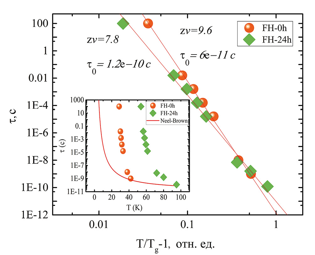 По данным магнитных измерений (статической магнитометрии, ac-восприимчивости) и мессбауэроской спектроскопии получена экспериментальная зависимость времени СПМ-релаксации от температуры. Результат аппроксимации этой зависимости в рамках скейлинговой модели позволил определить значения температуры формирования состояния, подобного спиновому стеклу, и характерные показатели степени zv. В нашем случае эти величины составляют zv = 9.6 и zv = 7.8 при температурах замерзания магнитных моментов Tg = 52.8 К и Tg = 27.6 К для отожженного (FH-24h) и исходного (FH-0h) образцов соответственно. Уменьшение показателя zv объясняется ростом влияния магнитных межчастичных взаимодействий и замедлением СПМ-релаксации.