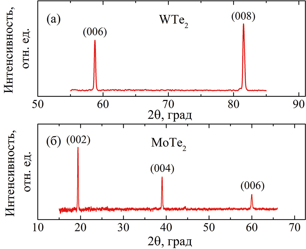 Аттестация полученных образцов проведена методом рентгеноструктурного анализа на дифрактометре DRON-2.0 в излучении Cr–Kα. Фрагменты рентгенограмм, снятых с поверхности монокристаллов WTe2 и MoTe2, приведены на рис. 1. Поскольку все пики могут быть индексированы как (00l), поверхности монокристаллов совпадают с плоскостью типа (001). Установлено, что монокристаллы WTe2 имеют орторомбическую структуру (пространственная группа Pmn21) [14], а монокристаллы MoTe2 – моноклинную (пространственная группа P21/m) [15].