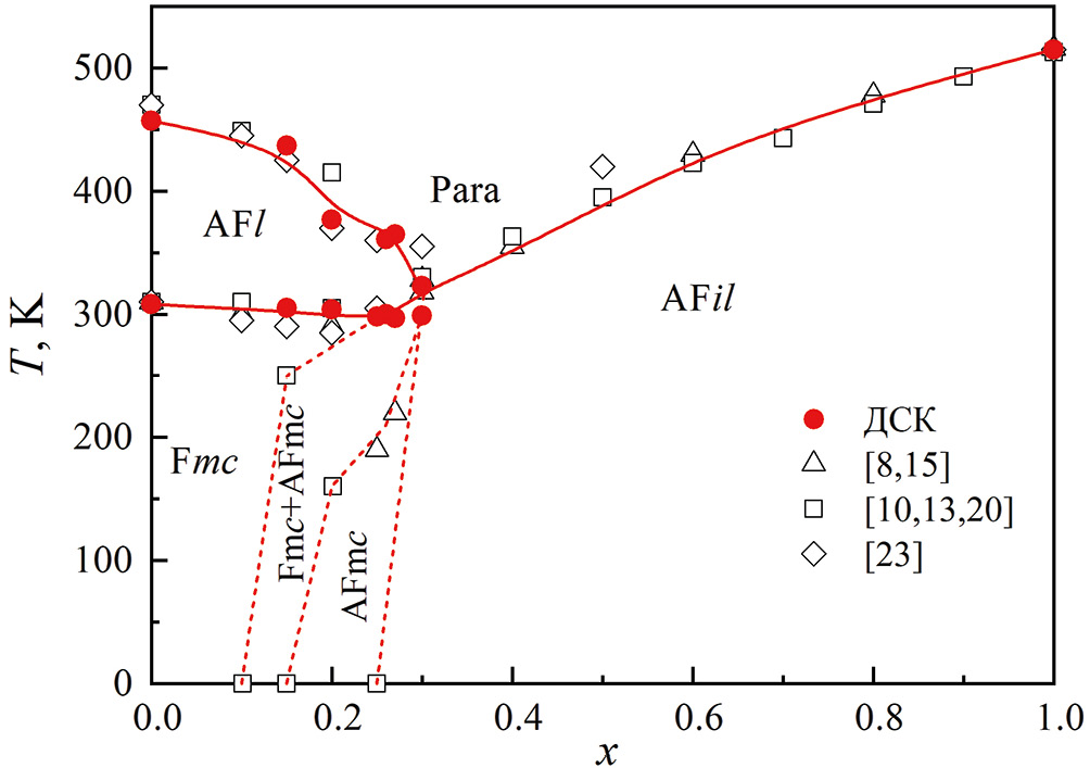Магнитная фазовая диаграмма La1-xYxMn2Si2, полученная по результатам исследования ДСК в данной работе, приведена на рис. 5. На этом же рисунке представлены значения температур магнитных фазовых переходов, полученных из измерений магнитной восприимчивости и намагниченности [8, 15], нейтронной дифракции [10, 13, 20] и эффекта Мессбауэра [23]. Видно, что определенные нами значения температур перехода из ферромагнитной фазы Fmc в антиферромагнитную AFl при x < 0.3, а также температуры разупорядочения антиферромагнитных фаз находятся в разумном согласии с результатами предыдущих исследований. Небольшое отличие температур Tc, определенных из исследования эффекта Мессбауэра, по-видимому, связано с тем, что мессбауэровские эксперименты были выполнены на образцах, в которых часть марганца была замещена изотопом 57Fe.