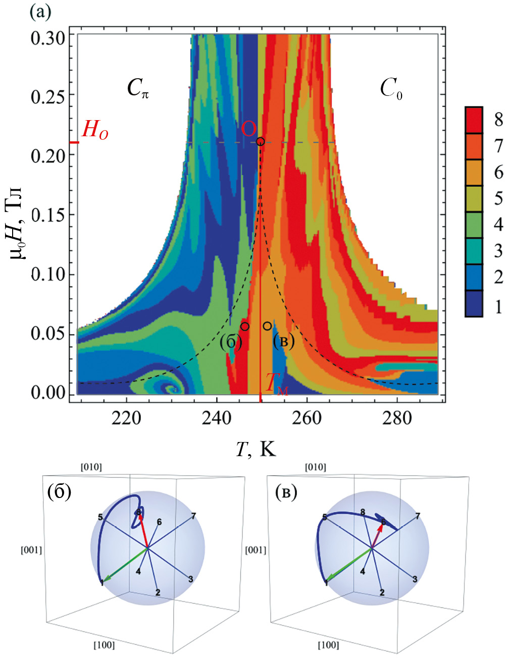 Проанализируем особенности эффективного термодинамического потенциала пленки феррита во внешнем магнитном поле, направленном вдоль легкой оси магнетика. Для моделирования воспользуемся следующими параметрами GdIG: K1 = –7 × 103 эрг/см3, χ⊥ ≈ 1.5 × 10–3, Md = 5μB и Mf(0) = 21μB в расчете на одну молекулу пленки феррит-граната, λMd = 5 × 105 Э. Далее, используя численные методы, построим фазовую H–T-диаграмму GdIG (рис. 1). Для более подробного ознакомления с аналитическим анализом фазовых диаграмм ферримагнитных пленок отсылаем читателей к работам [https://doi.org/10.1016/S1567-2719(05)80008-3, Белов К.П. Звездин А.К., Кадомцева А.М., Летвин Р.З. Ориентационные переходы в редкоземельных магнетиках // Наука, 1979, Гнатченко С.Л. Автореферат кандидатской диссертации // Харьков: ФТИНТ УССР, 1977, A. Zvezdin and V. Matveev, Sov. Phys. JETP 35, 140 (1972).] На данной диаграмме присутствуют две коллинеарные фазы Cπ и C0, где магнитные подрешетки ориентированы антипараллельно, θ = π и θ = 0. Линии AAʹ и BBʹ представляют собой линии фазового перехода второго рода между коллинеарными и неколлинеарными областями диаграммы NC1, NC2 и NC. Каждая из неколлинеарных фаз диаграммы отвечает определенным диапазонам полярного угла: ниже серой штриховой линии существуют две различные неколлинеарные фазы NC1 и NC2, каждая из которых соответствует диапазонам π / 2 < θ1 < π и π < θ2 < π / 2. Для фазы NC (область выше серой штриховой линии) полярный угол лежит в диапазоне 0 < θ < π. В силу симметрии системы легко получить, что каждому полярному углу в областях NC1 и NC2 соответствует 4 различных азимутальных угла. Таким образом, минимуму термодинамического потенциала в неколлинеарных областях соответствуют пары углов для фазы NC1 и для фазы NC2. Вставка на рис. 1 показывает возможные 8 состояний, отвечающих фазам NC1 и NC2, которые пронумерованы от 1 до 8 соответствующим образом: состояния (1, 2, 3, 4) относятся к области NC1, состояния (5, 6, 7, 8) относятся к области NC2. Красная линия TMO является линией фазового перехода первого рода между неколлинеарными фазами NC1 и NC2. Точка TM ≈ 250 К является температурой компенсацией феррита, в то время как точка О есть критическая точка перехода типа пар-жидкость [23]. Области диаграммы, расположенные под черными штриховыми линиями, есть области сосуществования двух неколлинеарных фаз. Записав условие устойчивости коллинеарной фазы в точке компенсации, где m = 0, легко получить, что критическое поле, соответствующее данной точке равно ≈ 0.21 Тл. Приведенный анализ в дальнейшем поможет изучению спиновой динамики в GdIG. Обратим внимание на то, что данное поле получилось существенно ниже, чем экспериментальные значения критических полей для феррит-гранатов [23]. Причиной этому может служить величина χ⊥, определяемая аналитически из описанной модели. В пленках гранатов ее величина может достигать χ⊥ ∼ 10–5, что вызывает увеличение характерных критических полей на несколько порядков. Здесь же можно отметить, что истинная величина данного поля может быть определена как , где Ha есть поле анизотропии, Hex – величина обменного поля. Также отметим, что в рамках работы мы не рассматриваем влияние одноосной анизотропии, которая существенно увеличивает характерные значения критических полей. Однако в данном тексте мы рассматриваем лишь влияние кубической анизотропии и размагничивания системы на спиновую динамику. С учетом всего описанного выше, мы вос