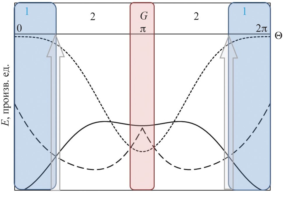 Рис. 3. Зависимость магнитной энергии различных структур от угла смешивания орбитальных функций Θ с пространственным распределением орбиталей в соответствии с формулами (4), (7). 1, 2 или G обозначают диапазоны углов Θ с разными типами магнитной структуры.