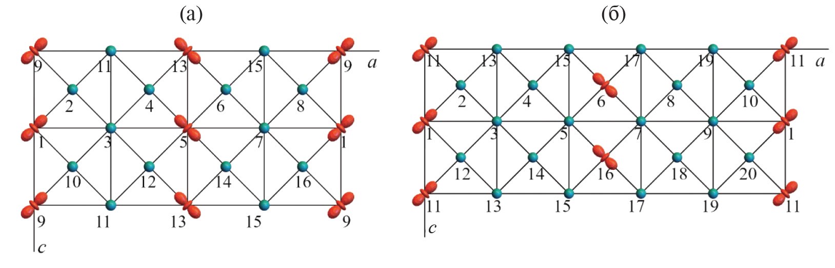 Рис. 5. Распределение магнитных подрешеток в плоскости ac; a – La1/4Ca3/4MnO3, в соседней плоскости номер подрешетки увеличивается на 16; б – Bi1/5Ca4/5MnO3, в соседней плоскости номер подрешетки увеличивается на 20.
