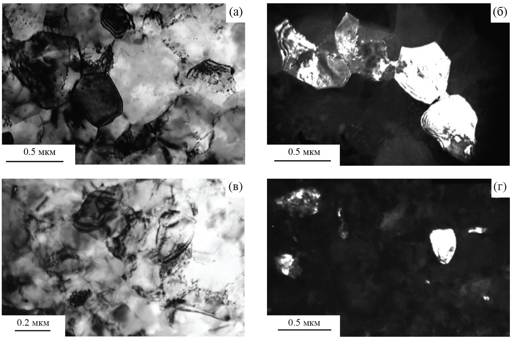Рис. 1. Структура железа после деформации при 250°С (а, б) и 20°С (в, г); а, в – светлопольные изображения; б, г – темнопольные изображения в рефлексе типа {110}. ПЭМ.