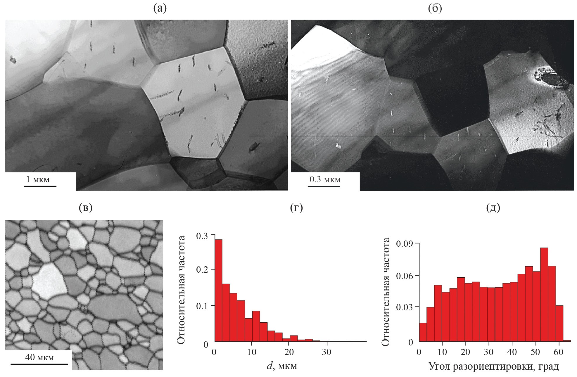 На гистограмме распределения зерен по размерам, построенной по данным РЭМ, пик соответствует элементам (зернам и субзернам) субмикронного размера (рис. 3в), а средний размер зерна составляет 2 мкм. В структуре наблюдаются соседние зерна с близкой ориентировкой (рис. 3б). При этом распределение границ по углам разориентировки говорит о формировании случайного ансамбля хаотически ориентированных зерен (рис. 3г).