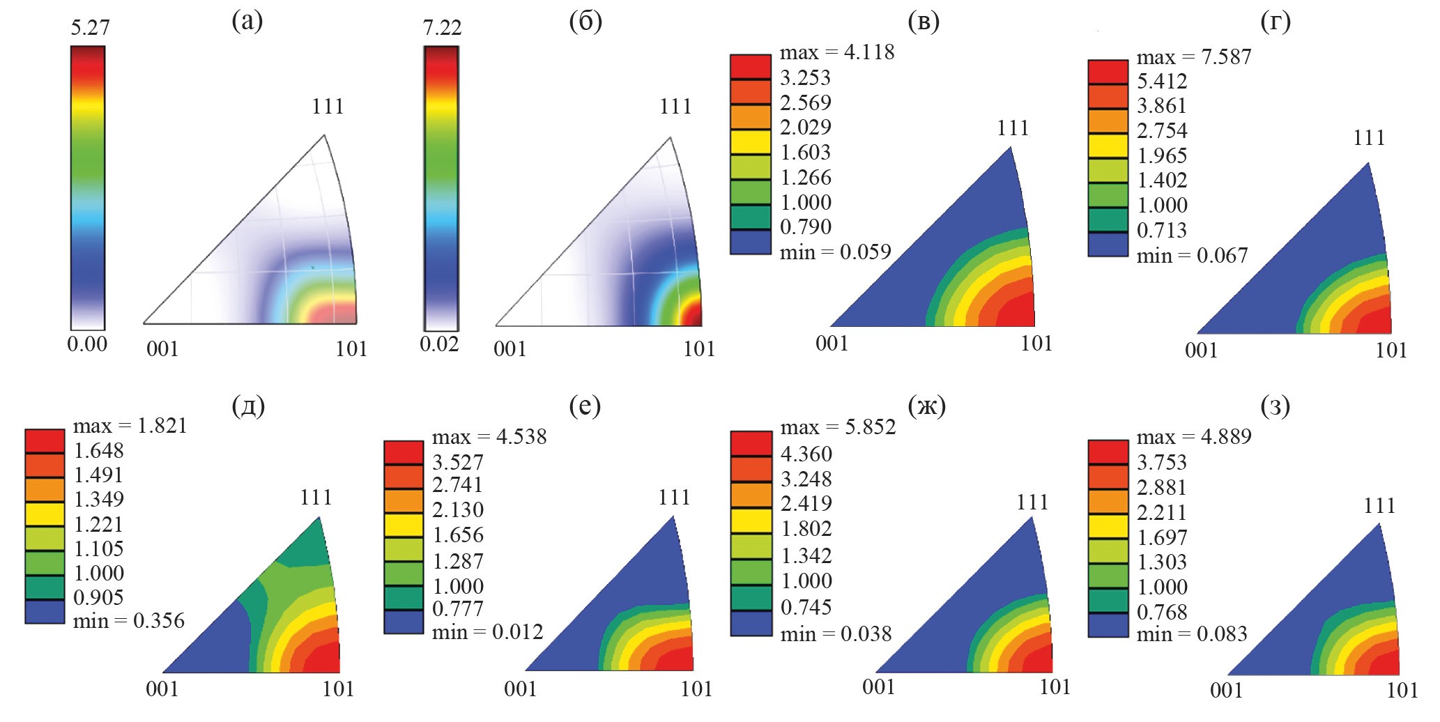 Известно [29], что при сдвиговой деформации ОЦК-металлов текстура характеризуется образованием волокон двух типов. Первый тип представляет собой плоскость {110} ‖ плоскости сдвига и содержит компоненты F ({110}<001>), J ({110}<112>) и E ({110}<111>). Второй тип — {hkl} <111> содержит компоненты D ({112}<111>) и E ({110}<111>). Наиболее явно они проявляются на сечениях ФРО (функции распределения ориентировок) при φ2 = 0° и 45° (рис. 9а). Компоненты F, J и E на ОПФ должны приводить к усилению полюсной плотности вблизи полюса 101.