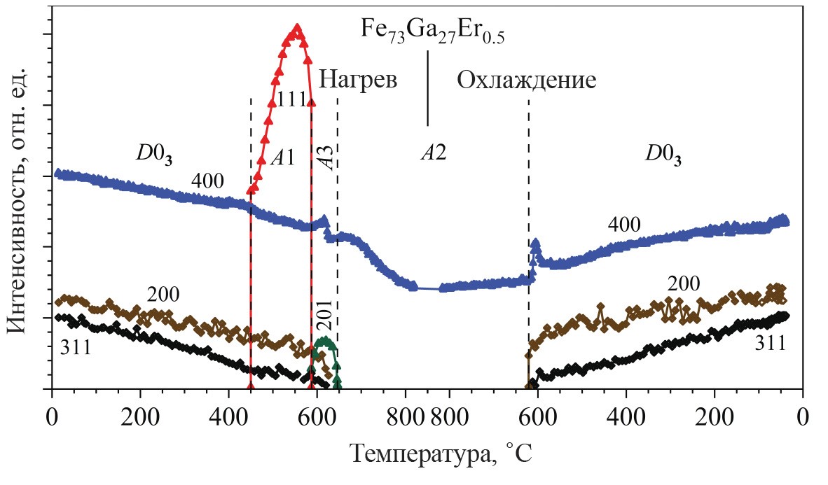 В Fe–Ga-сплавах с ~27 ат.% Ga возможно образование пяти типов структур [18], три из них основаны на ОЦК-ячейке: неупорядоченная А2 (кубическая, , a ≈ 2.91 Å, N = 2), частично или полностью упорядоченные D03 (кубическая, , a ≈ 2aА2 ≈ 5.82 Å, N = 16) и B2 (кубическая, , a ≈ 2.92 Å, N = 2), а также L12 (кубическая структура ГЦК-типа, , a ≈ 3.72 Å, N = 4) и D019 (гексагональная структура ГПУ-типа, P63/mmc, a ≈ 5.22 Å, c ≈ 4.23 Å, N = 8). Разупорядочение структуры L12 переводит ее в А1 (ГЦК-ячейка, , a ≈ 3.72 Å), а структуры D019 – в А3 с уменьшенным в 2 раза параметром а (a ≈ 2.64 Å). Далее для единообразия индексации дифракционных пиков структур А2, B2 и D03 будет использоваться элементарная ячейка фазы D03, в которой основные пики определяются условием h + k + l = 4n (напр., 220, 400 и т.д.). Сверхструктурные пики в этой фазе разрешены, если все индексы Миллера нечетные (напр., 111, 311 и т.д.) или если h + k + l = 2n (напр., 200, 222 и т.д.). В фазе А2 сверхструктурные пики запрещены, а в B2 разрешены основные пики, если h + k + l = 4n и сверхструктурные, если h + k + l = 2n.