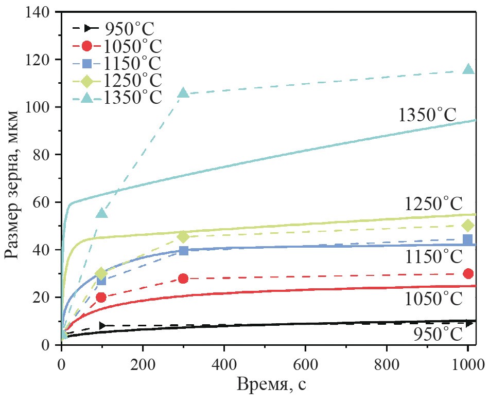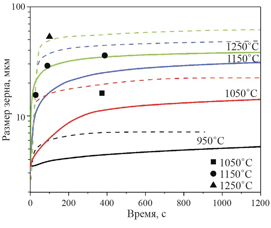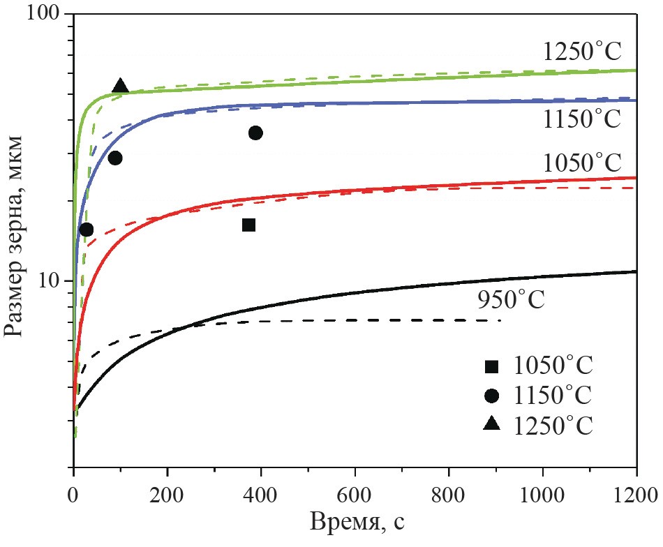 3. Fig. 2. Change in the size of austenitic grains during annealing according to data [19]. Symbols and dotted lines are experimental data; solid lines are the results of modeling based on PTE.