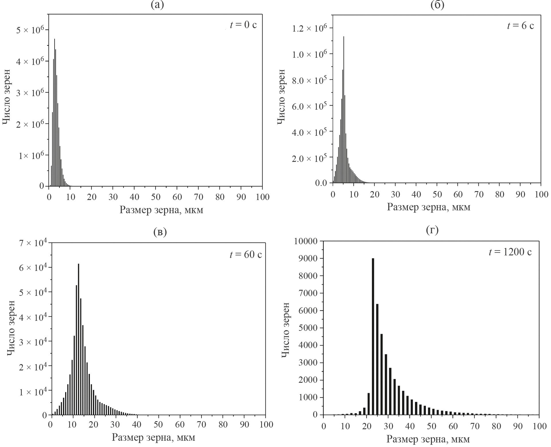 Рис. 3. Изменение распределения зерен по размерам в ходе отжига при 1150°С (результаты моделирования на основе ПТЭ, соответствующие данным [18]).